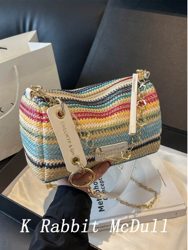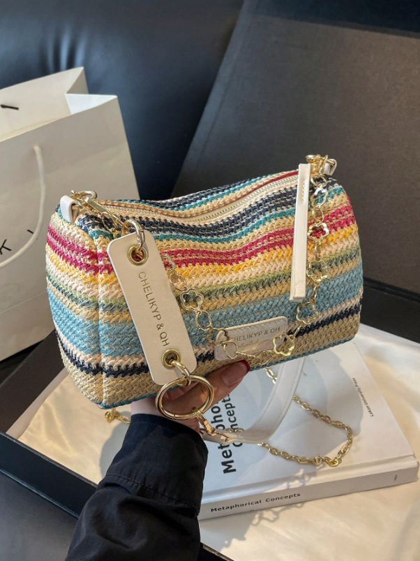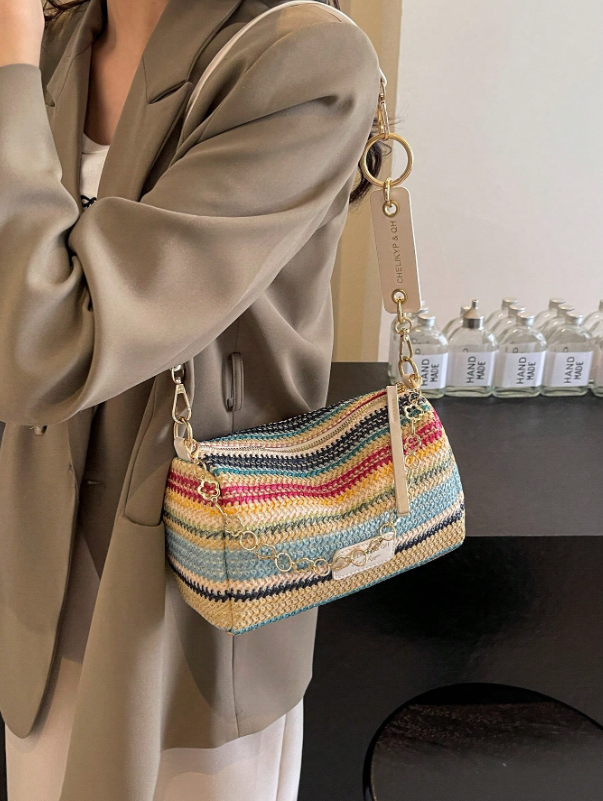 حقيبة كتف مصنوعة من القش المنسوج بتصميم مخطط